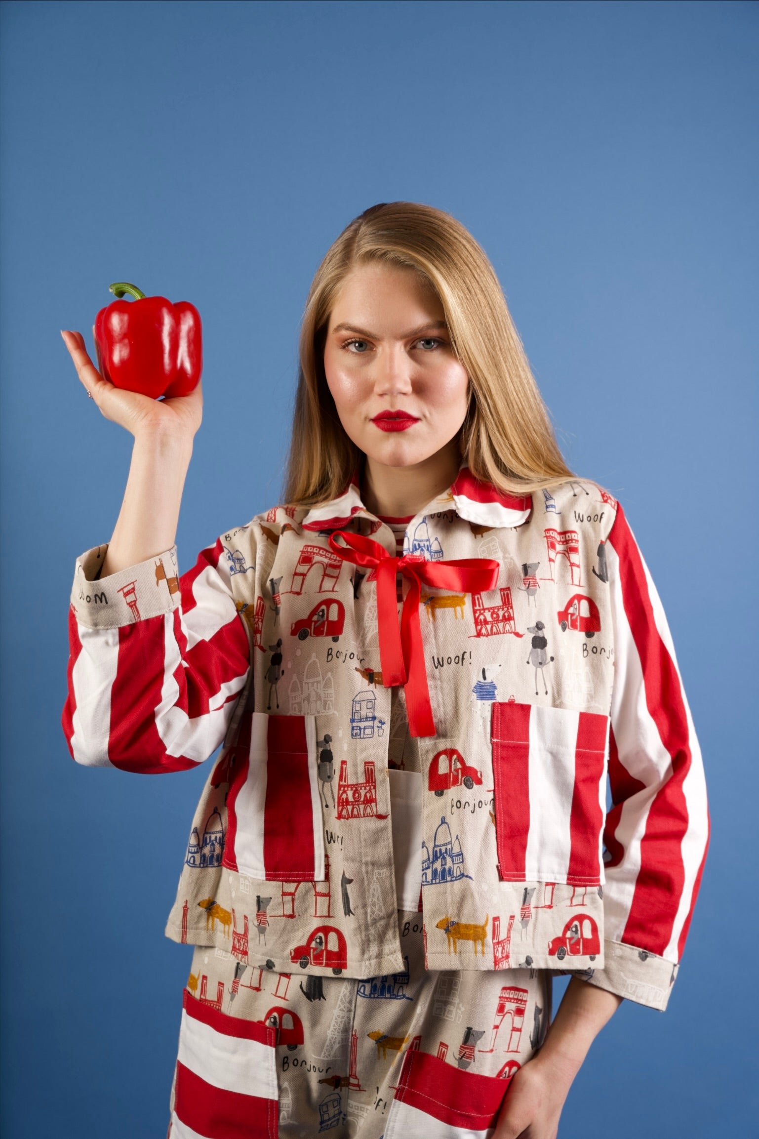 This jacket embodies the Parisian lifestyle. Playful illustrations meet bold red and white stripes and striking contrasting pockets. The relaxed fit and feminine bow at the collar give it a charming, confident look.