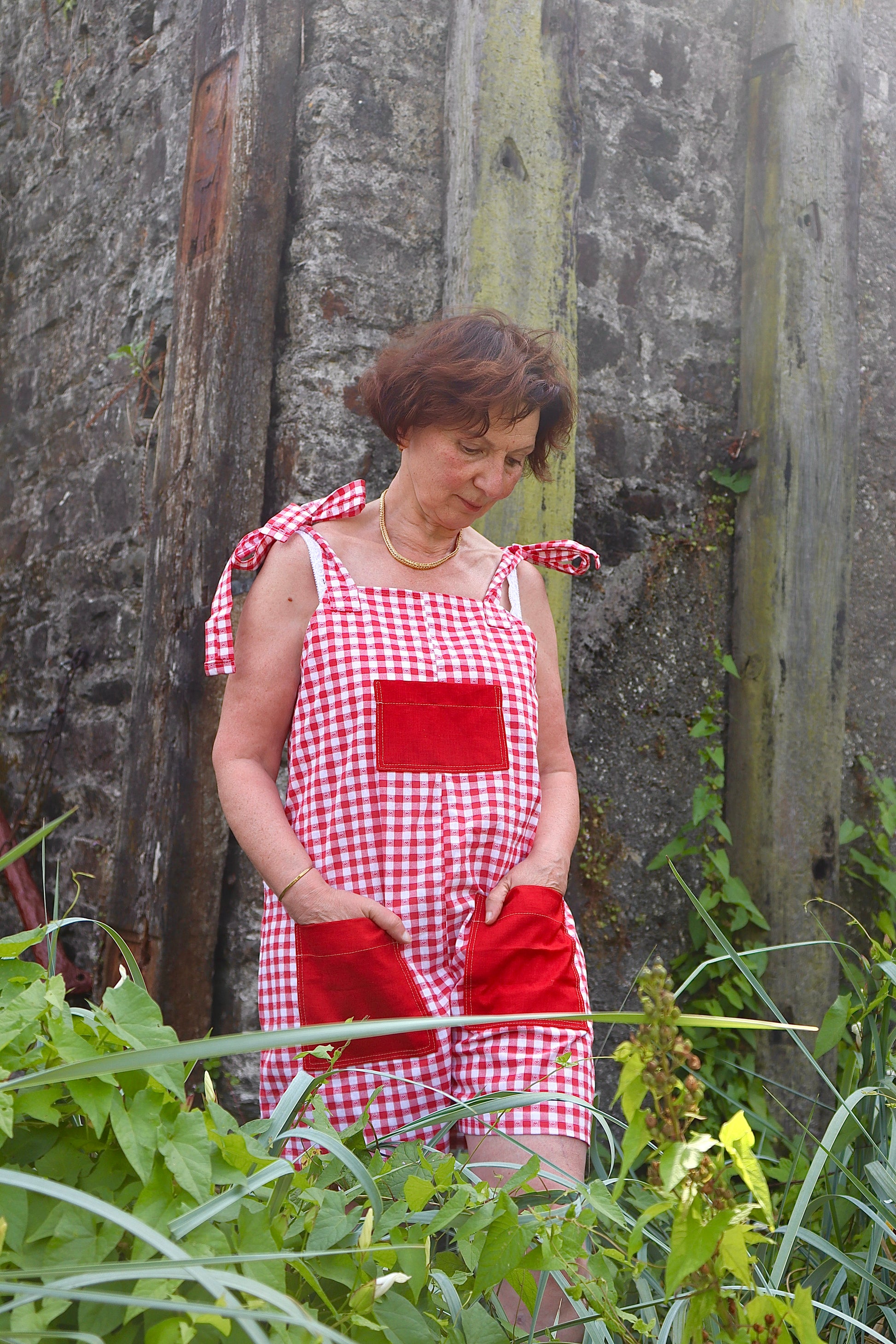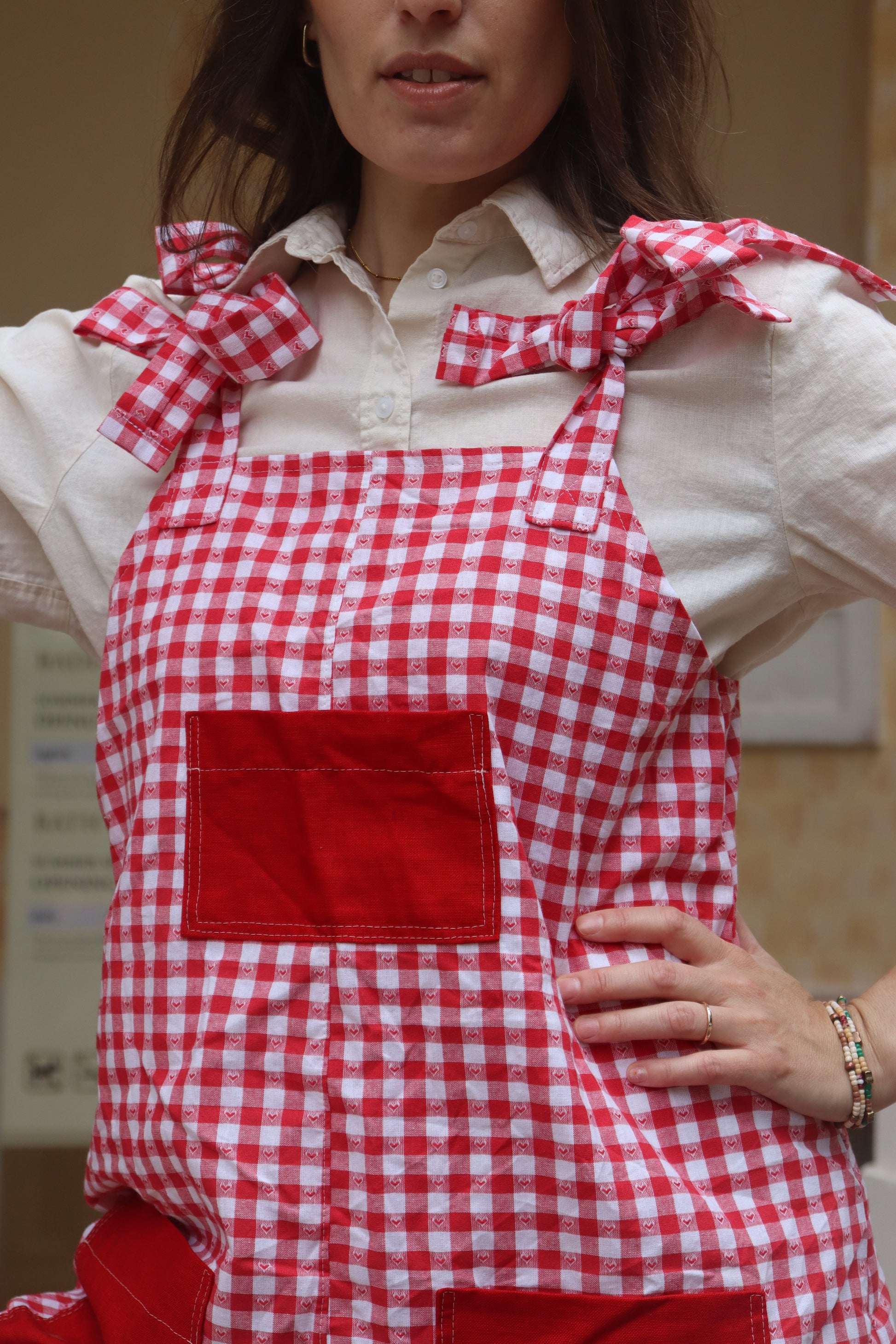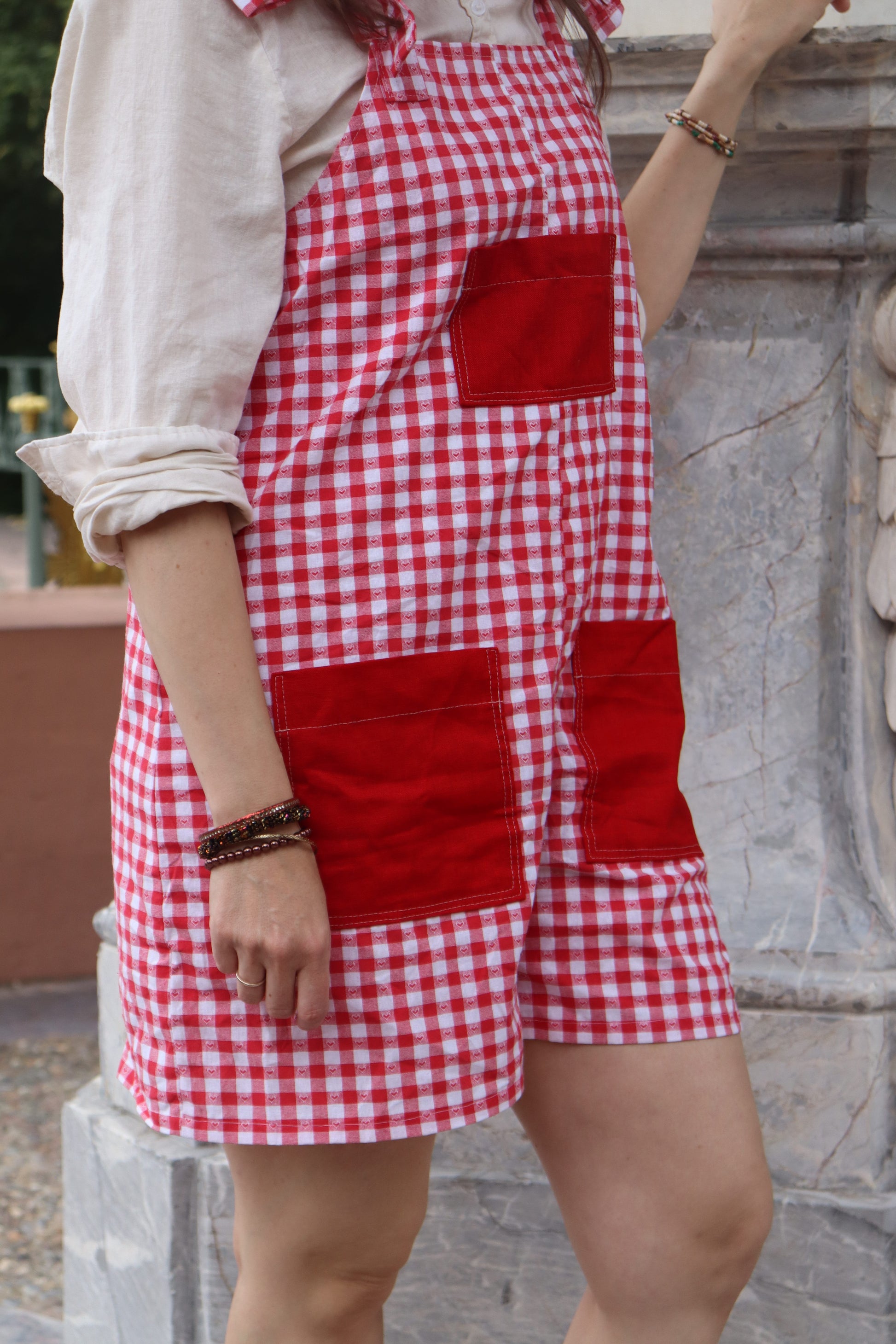 This jumpsuit is the perfect blend of playful vintage charm and modern streetwear. The red and white gingham check pattern adds a summery touch, while the bright red contrast pockets add a cool highlight.
