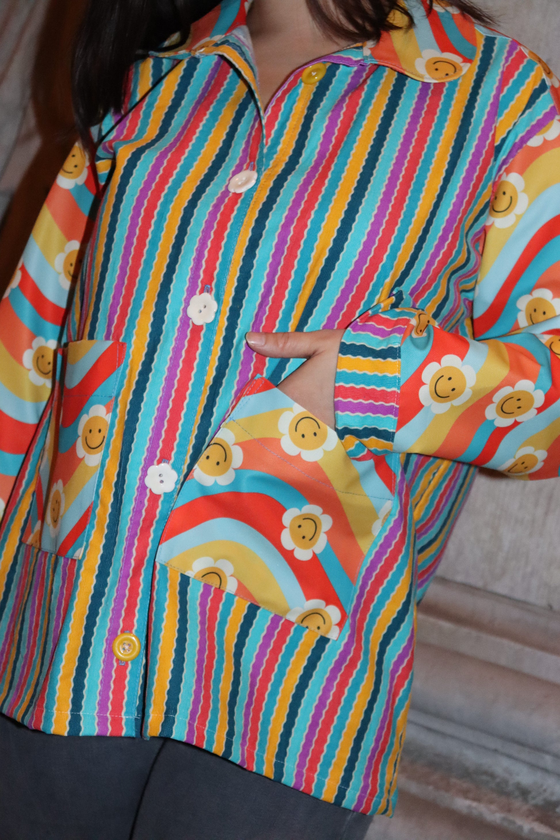 - Handgemachtes Unikat mit buntem Streifenmix & Smiley-Blumenprint