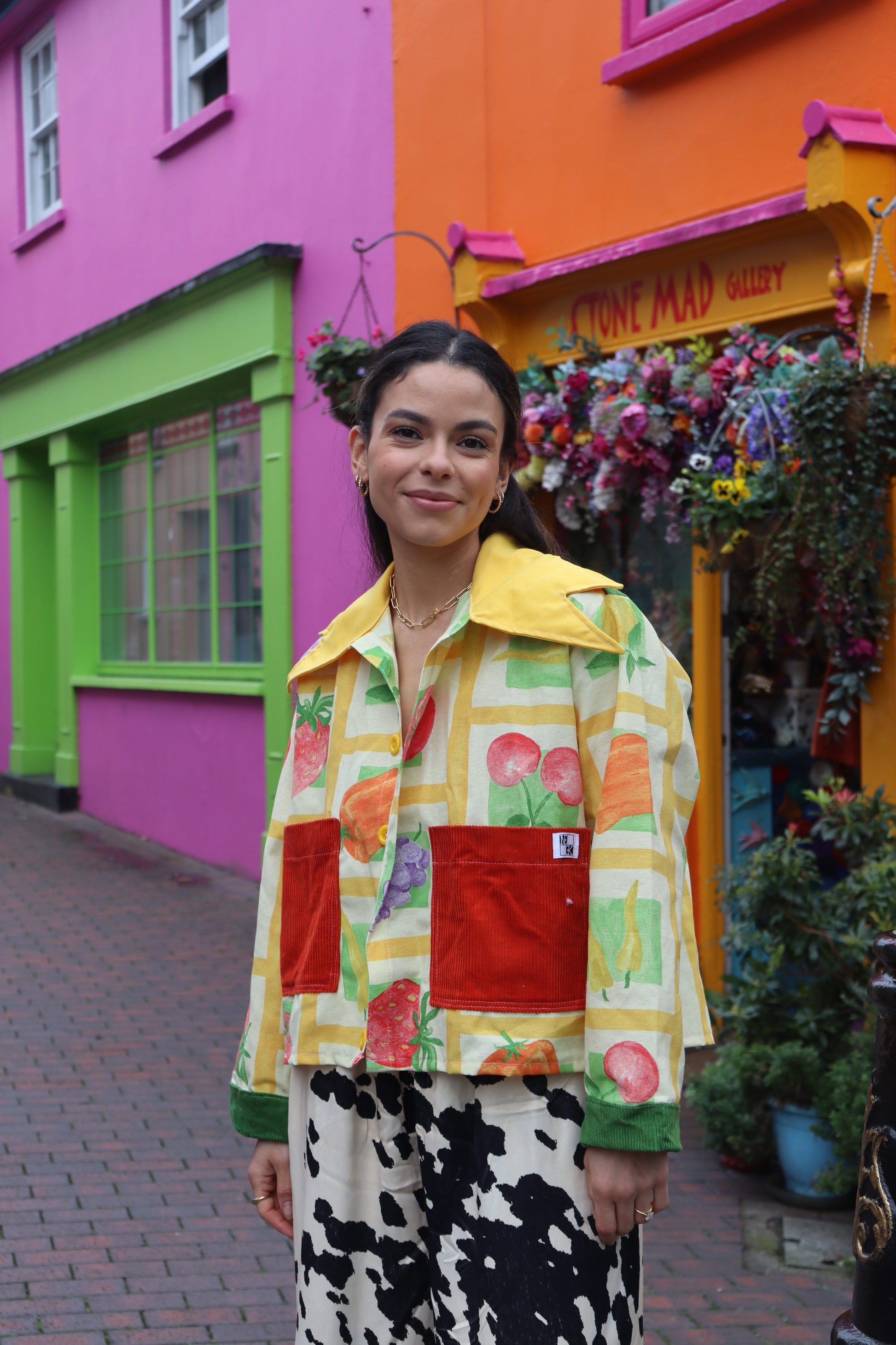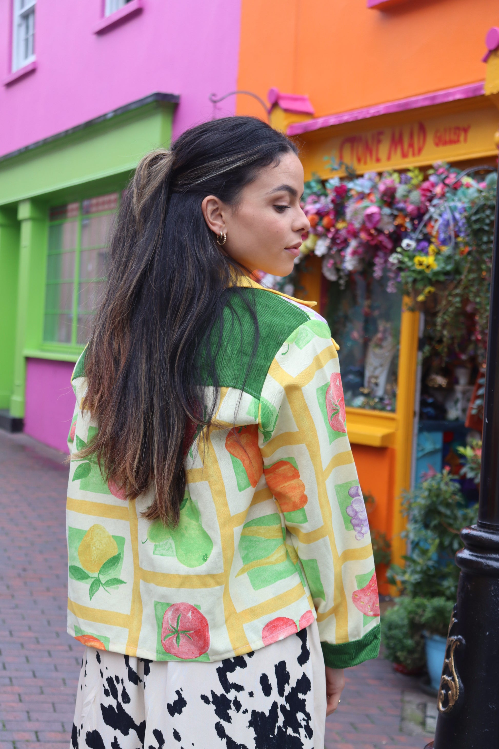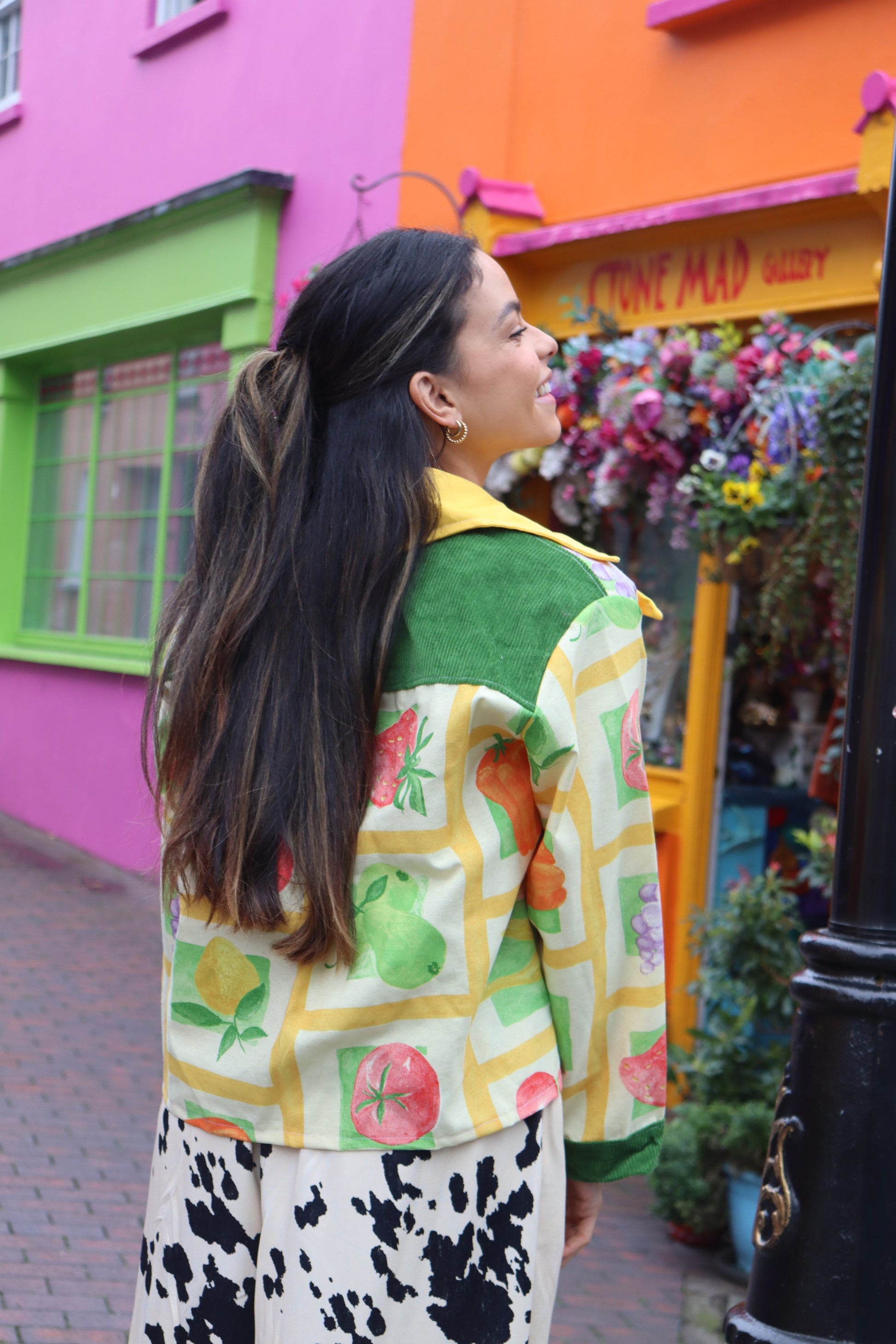 Unsere Hemdjacke SERENA kombiniert humorvolle Obstprints 🍎🍇 mit warmen Cordtaschen und einer einzigartigen Statement-Kragenform, die sofort auffällt.