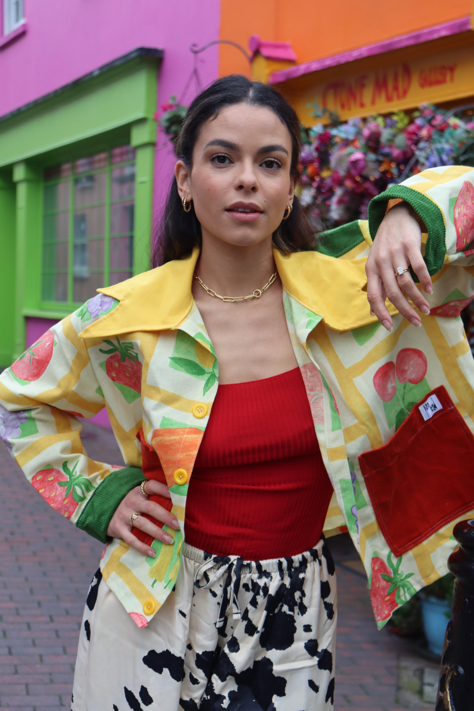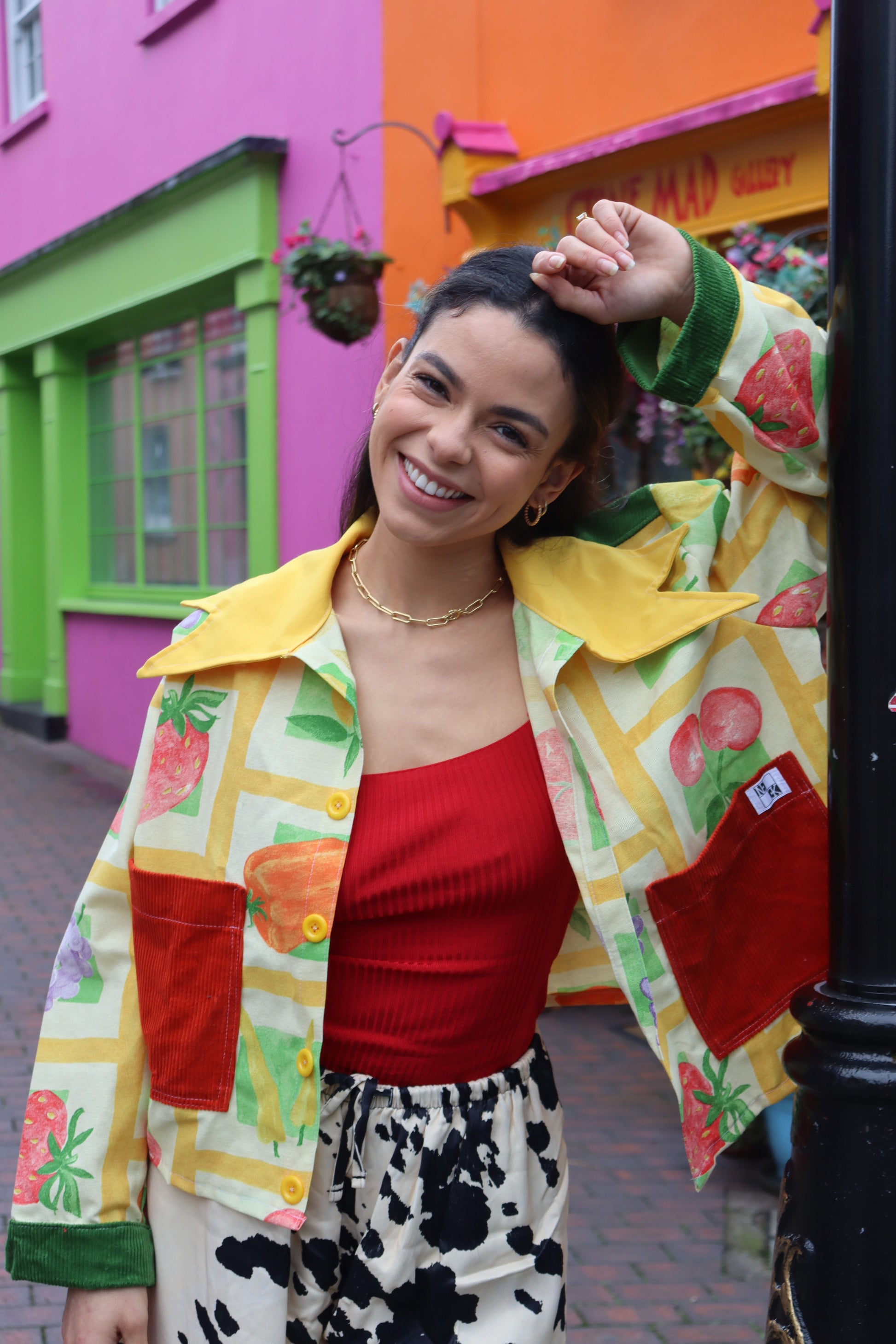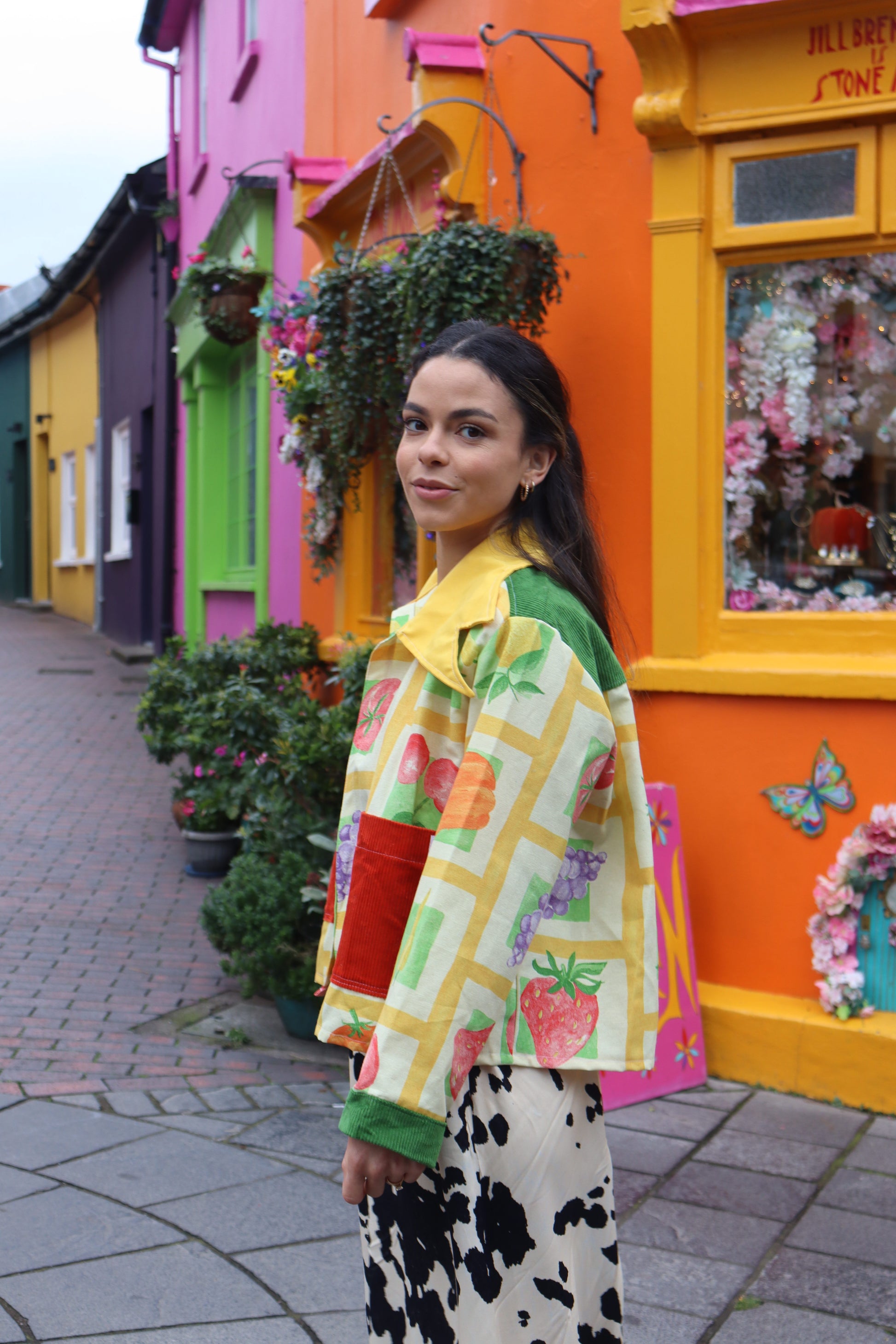 Unsere Hemdjacke SERENA kombiniert humorvolle Obstprints 🍎🍇 mit warmen Cordtaschen und einer einzigartigen Statement-Kragenform, die sofort auffällt.