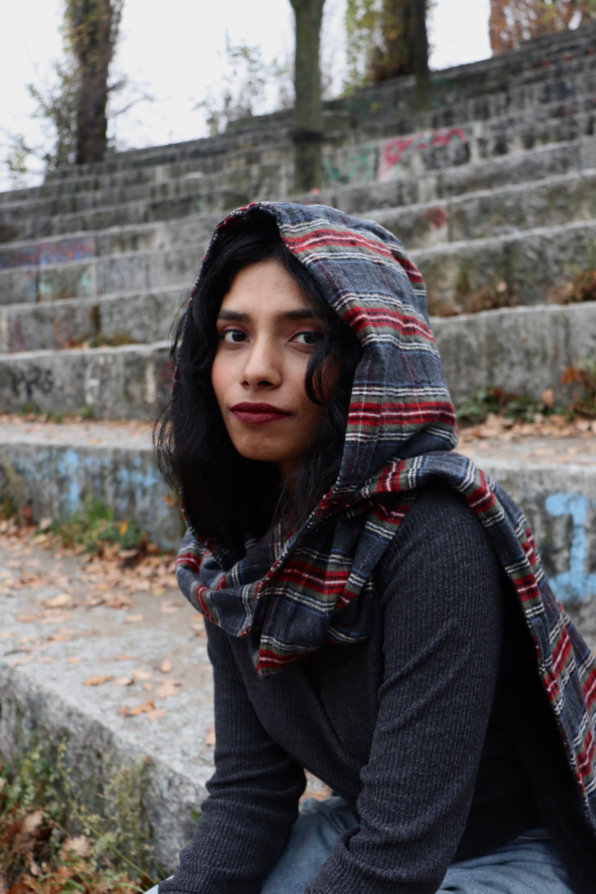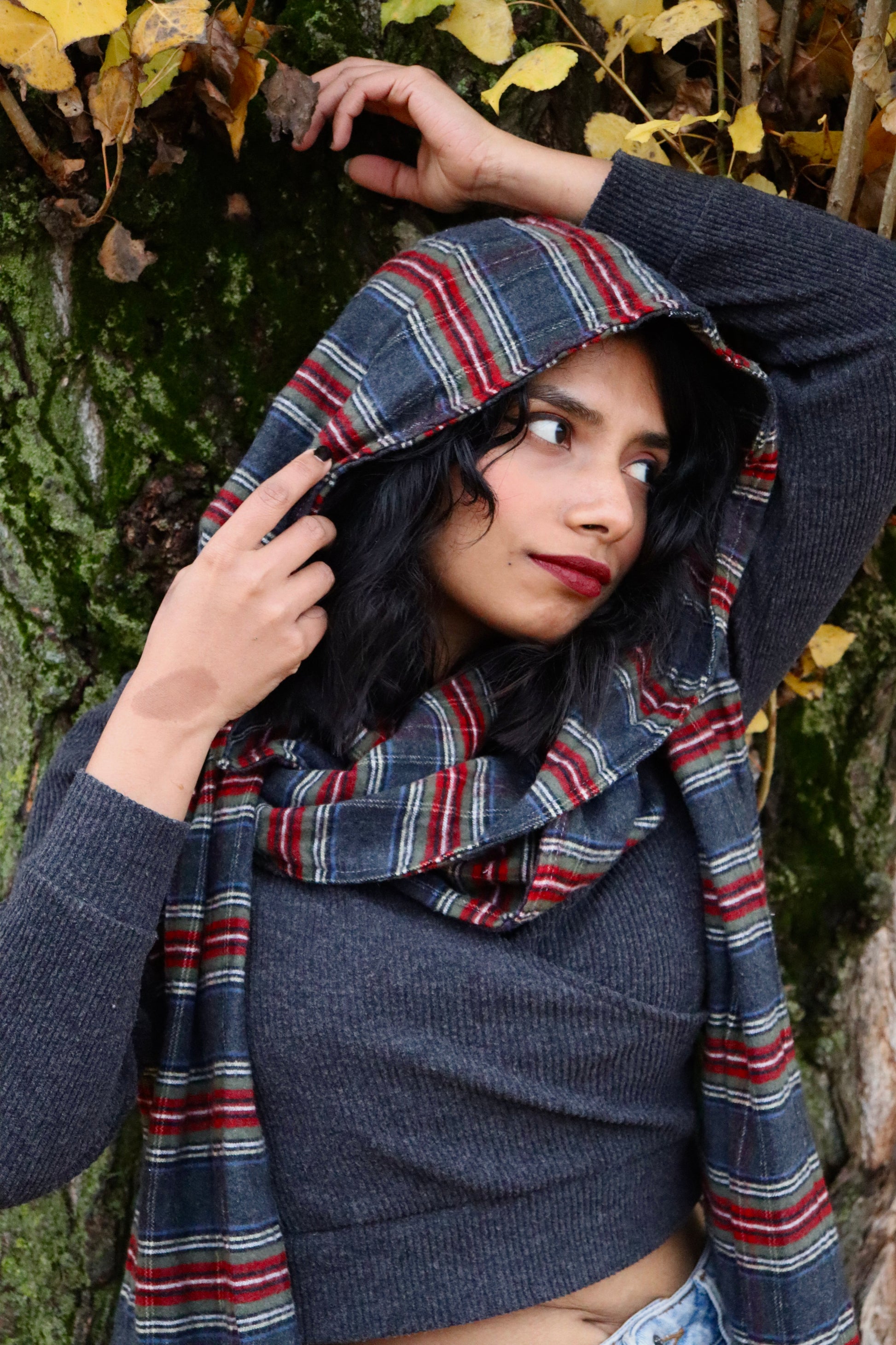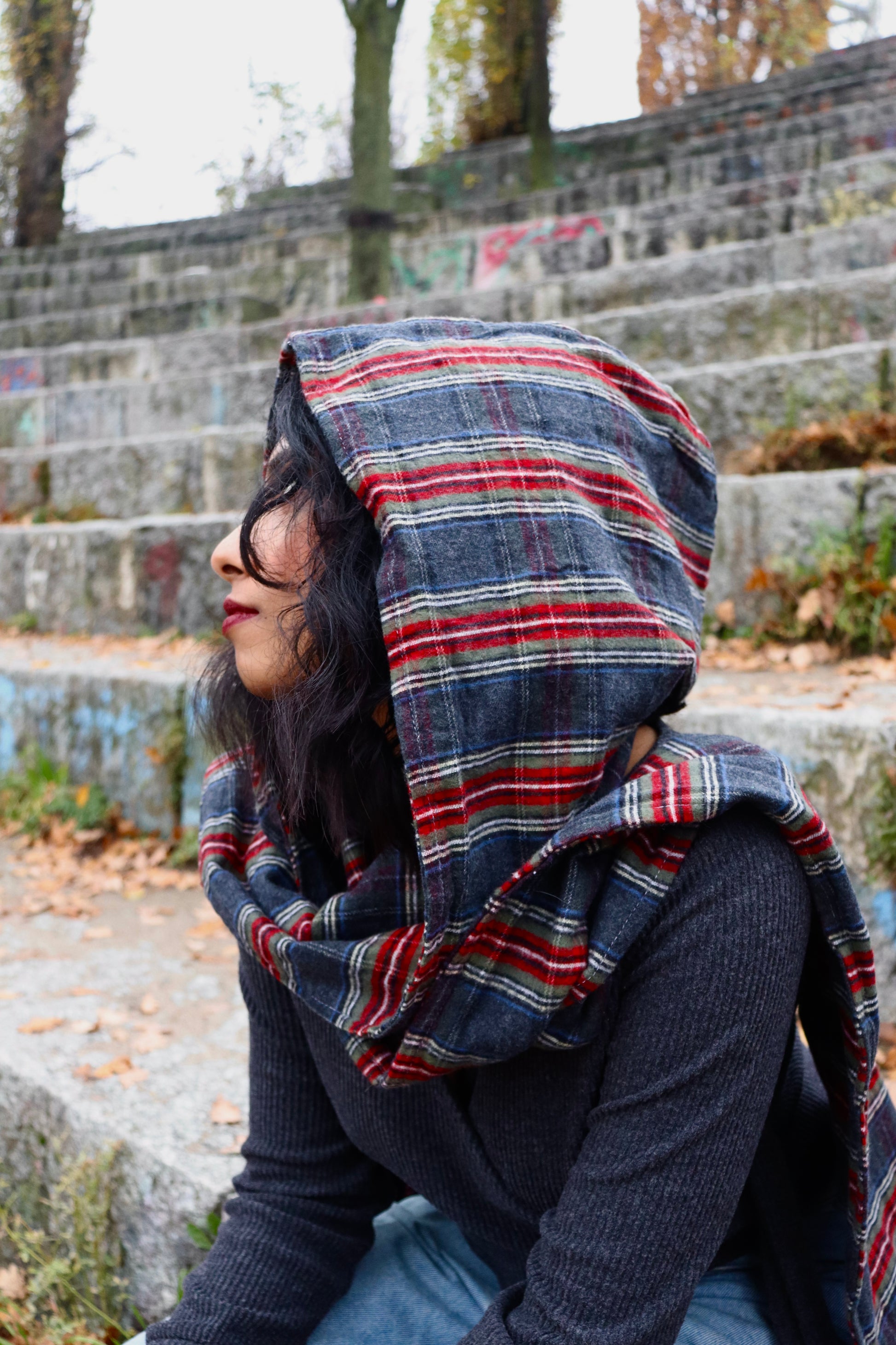 Hergestellt aus einem angenehm weichen, karierten Stoffmix in warmen Herbstfarben, schmiegt sich SHEMU sanft an Hals und Kopf. Die Kapuze sitzt locker und schützt vor Wind, während der Schalteil sich vielseitig binden, wickeln oder drapieren lässt.